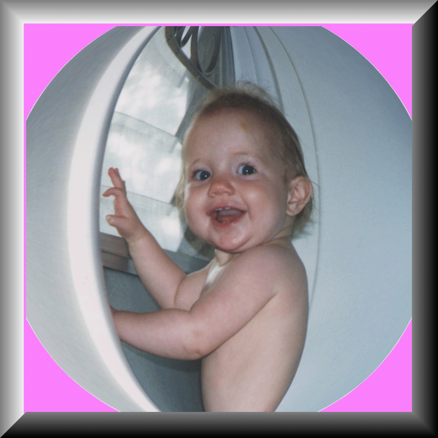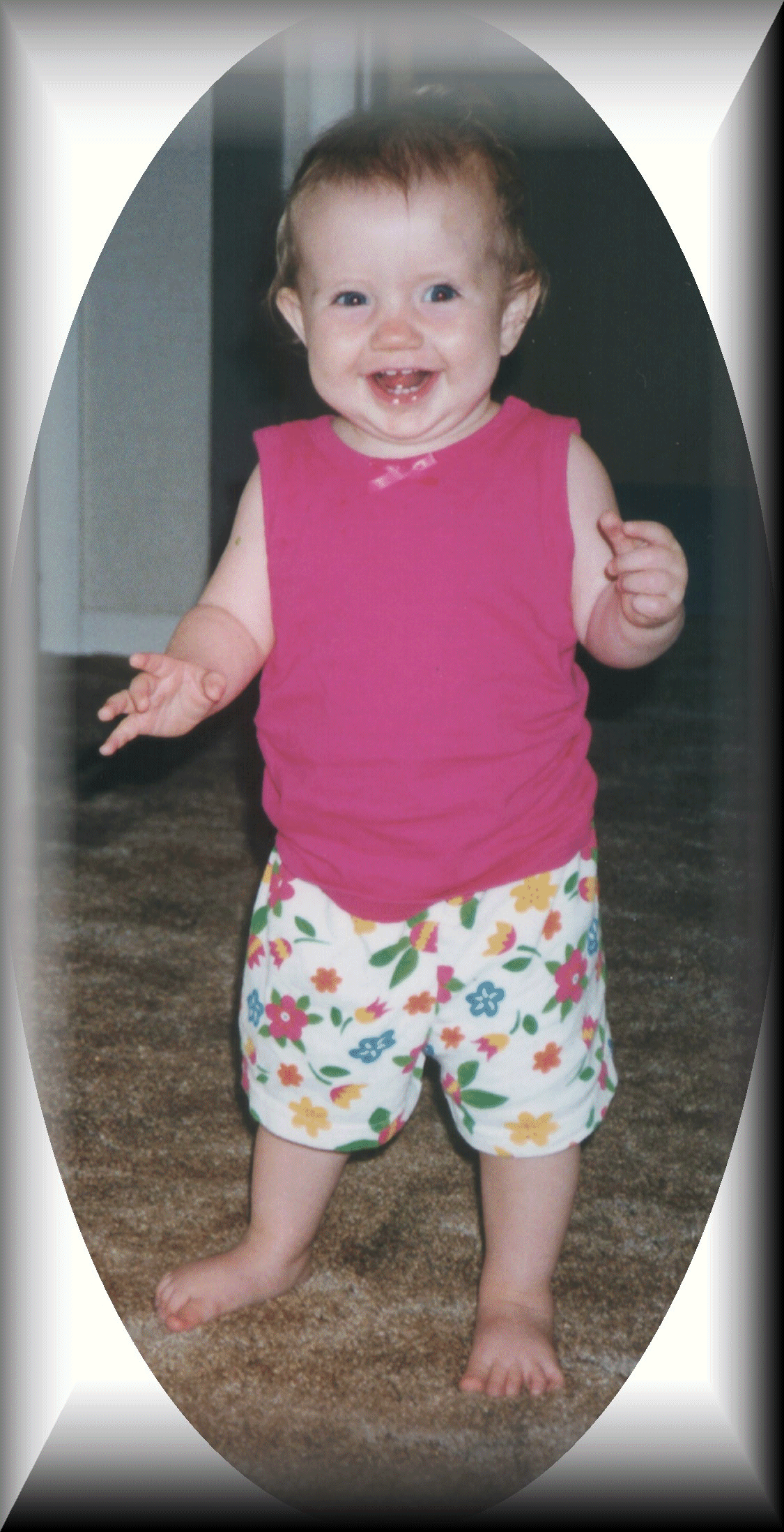 Hannah Nicole is One Year Old! I'm almost 20 lbs. and I'm 27 inches tall. I have 8 teeth, and a bunch more are ready to pop (ouch!) in. I've been real healthy, and I've been real fun. I can walk and 'talk', and say Daa-Daa and Maa-Maa. Some of my favorite sounds to make are that of a fan, boat, car, truck, plane, tree, sloppy wet raspberry ;), or a little hearty AAhhhhh after taking a big drink. I know how to put things In and take things Out, I know who my Mommy and Daddy are, and I know who I am too! I know where my hair is, and I can 'brush my teeth' and 'comb my hair'. I can even stand on one leg at a time! I love the outdoors, and I really like to play with Ryan and John-John. My wagon is one of my coolest presents that my parents pull me all around in. If you haven't seen me lately, you're missing out. I'm doing new things every single day, and having lots of fun!! XOXOXOXOXO, Hannah
